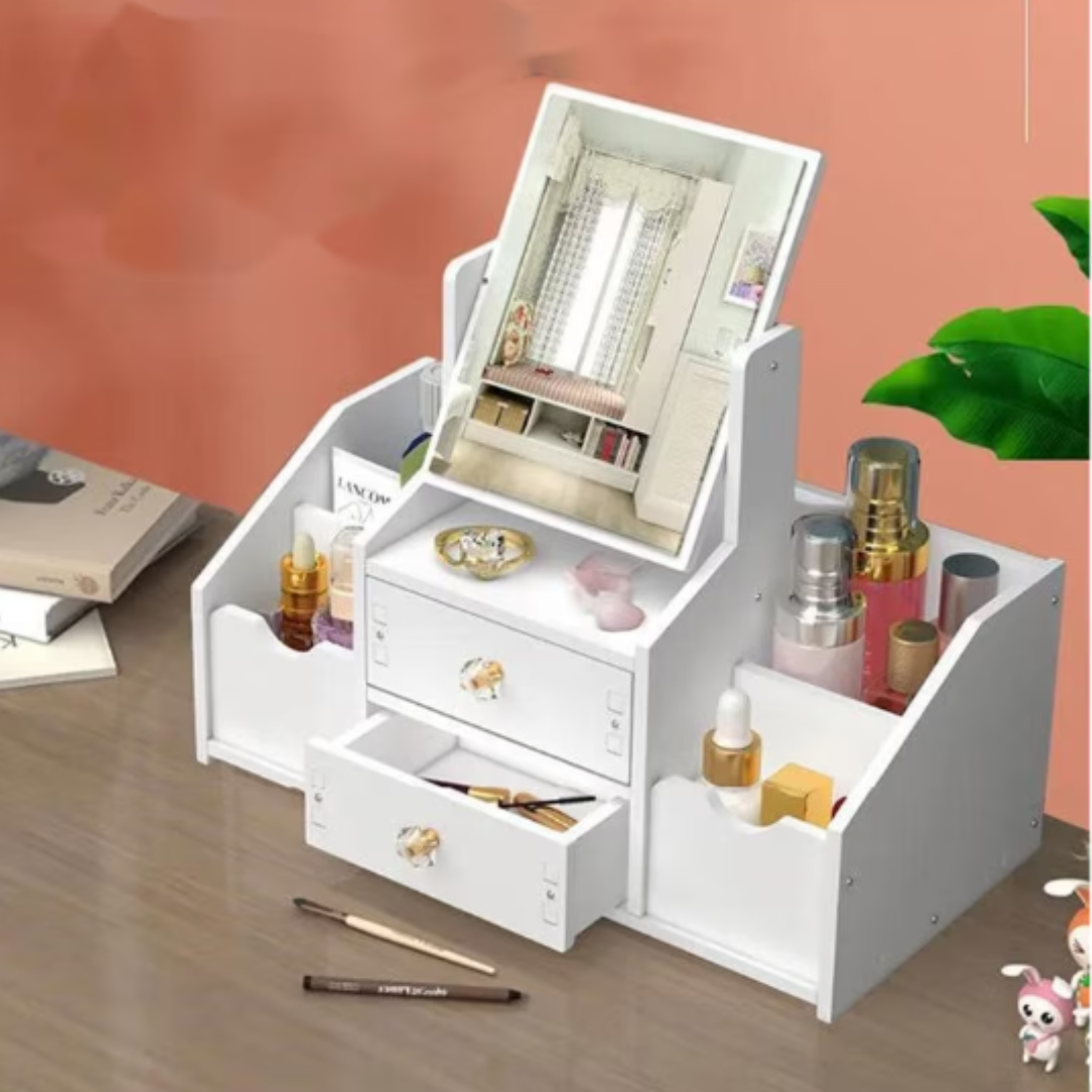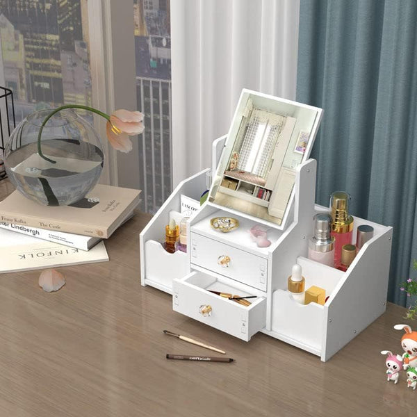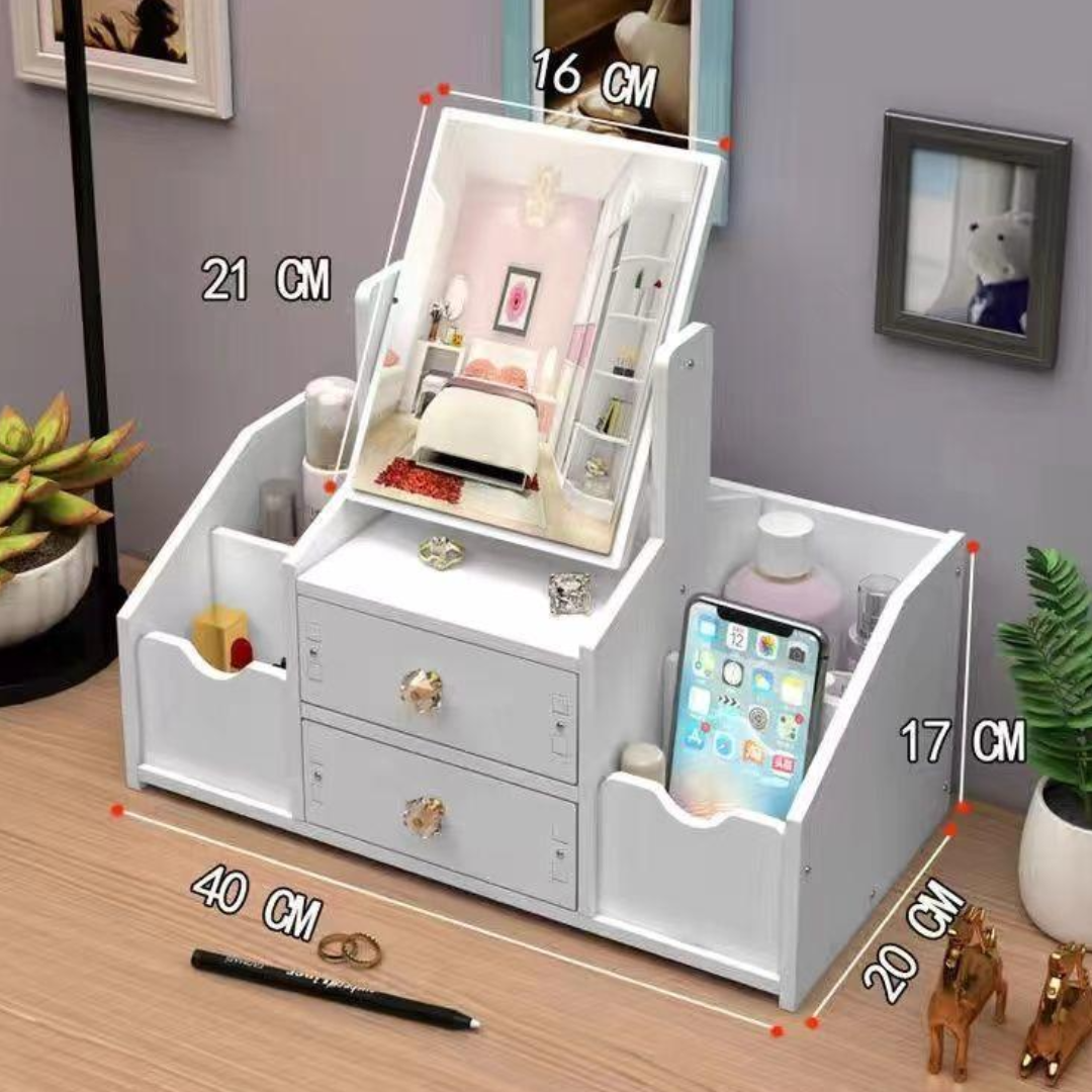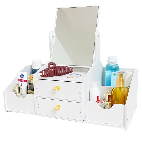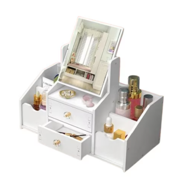 Organizator pentru cosmetice si bijuterii, suport Make-up, Oglinda dreptunghiulara, 4 compartimente, 2 sertare