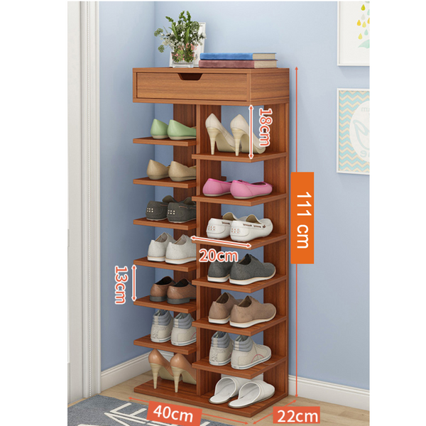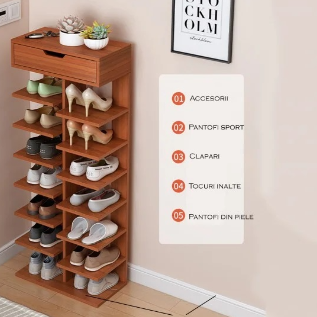 Pantofar dublu spatios, cu 7 etaje, elegant si versatil, culoare lemn inchis