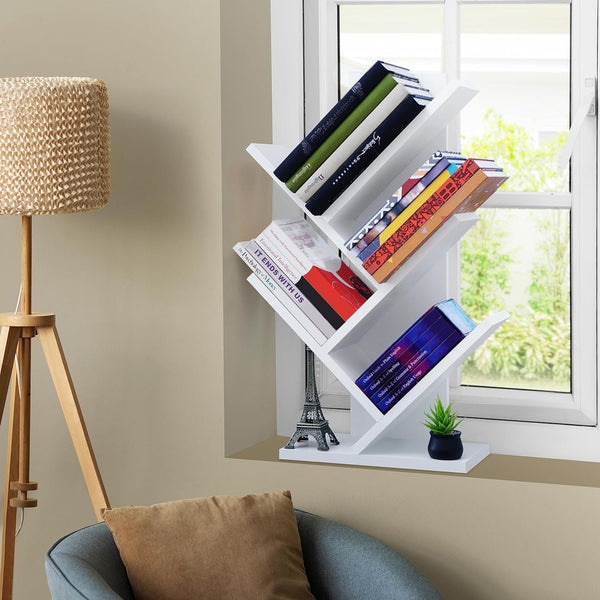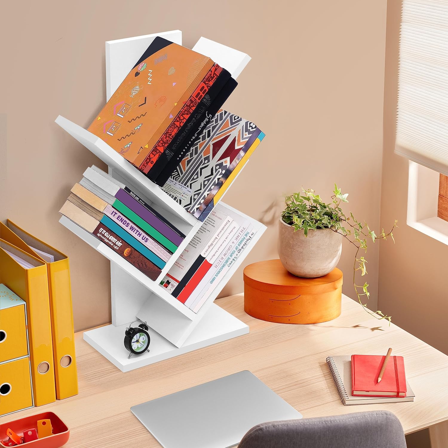Raft modern pentru depozitare carti, organizator din lemn cu 4 niveluri, alb