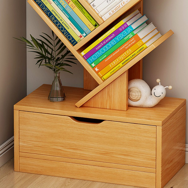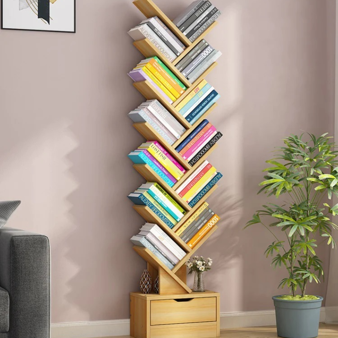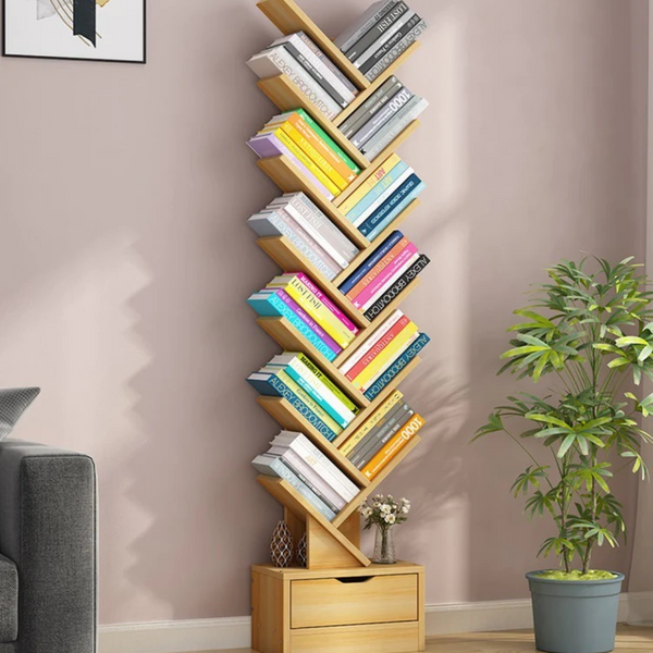 Raft modern pentru depozitare carti, organizator din lemn in forma de copac