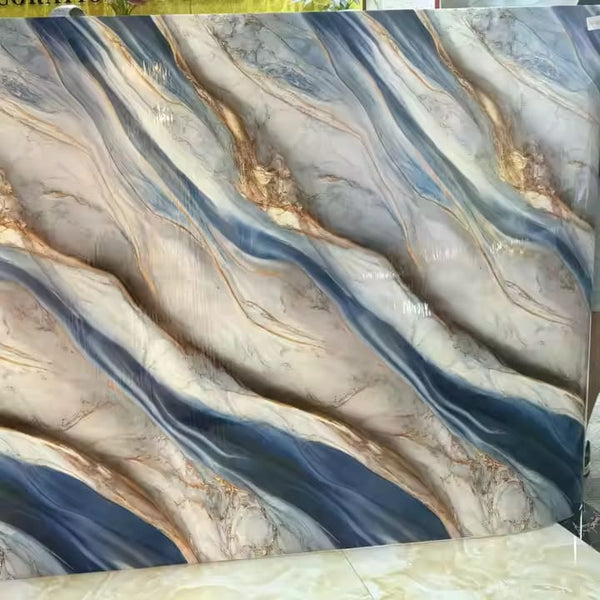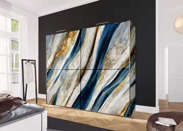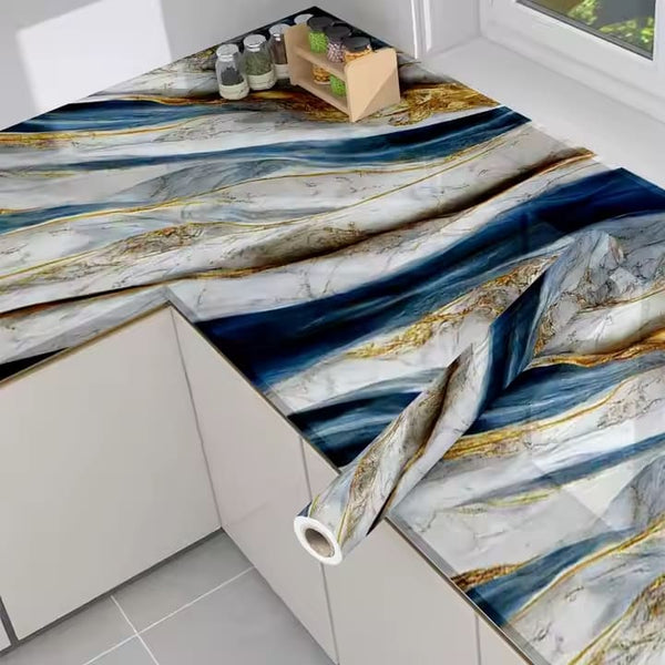 Folie autoadeziva pentru perete, tip marmura in straturi albastre si aurii, 0.6 x 3 m