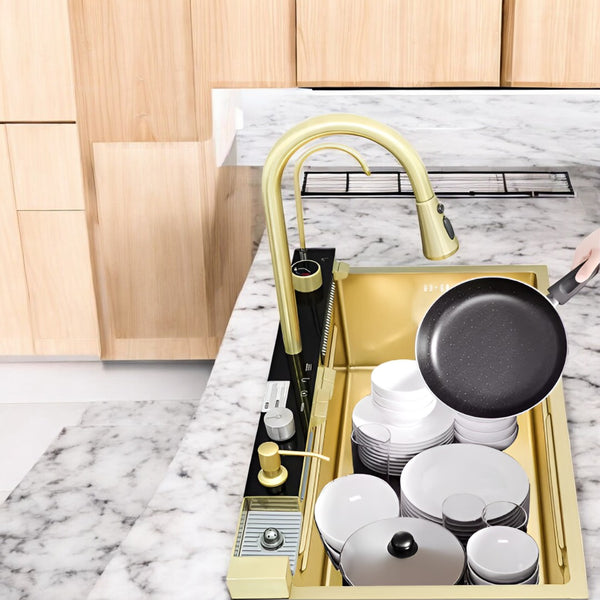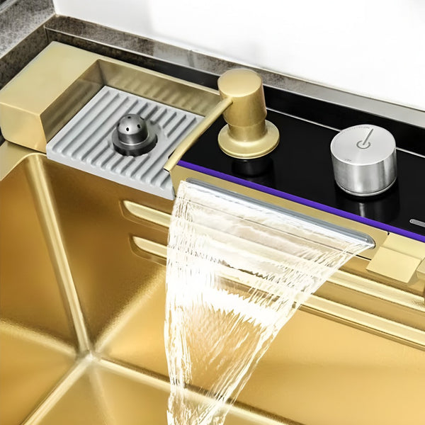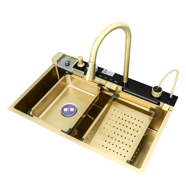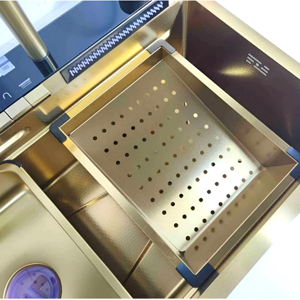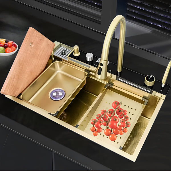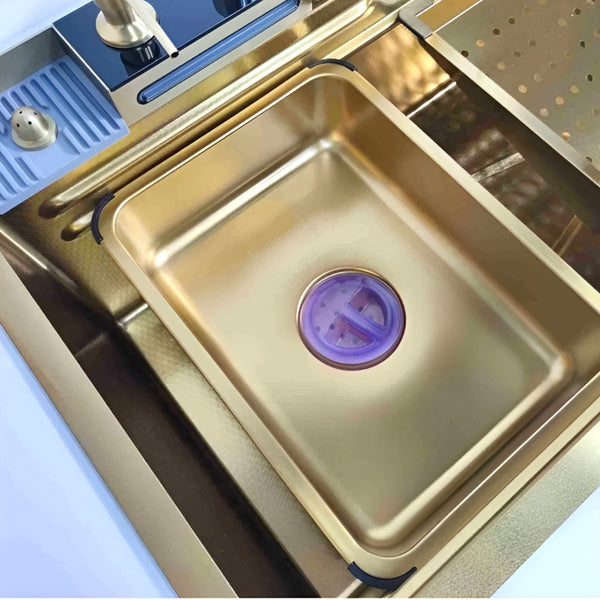 Set chiuveta bucatarie multifunctionala, otel inoxidabil, statie de lucru, dus extractabil, 4 moduri de spalare, spalator pahare, dozator sapun, accesorii scurgere incluse, auriu