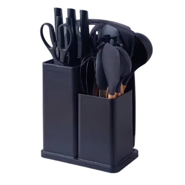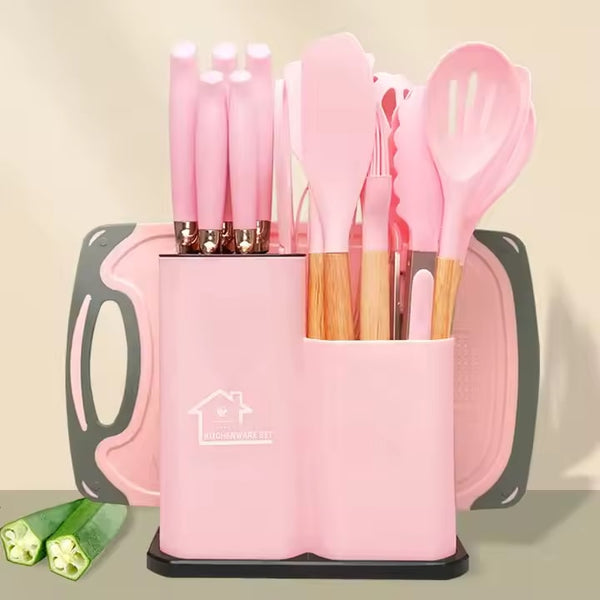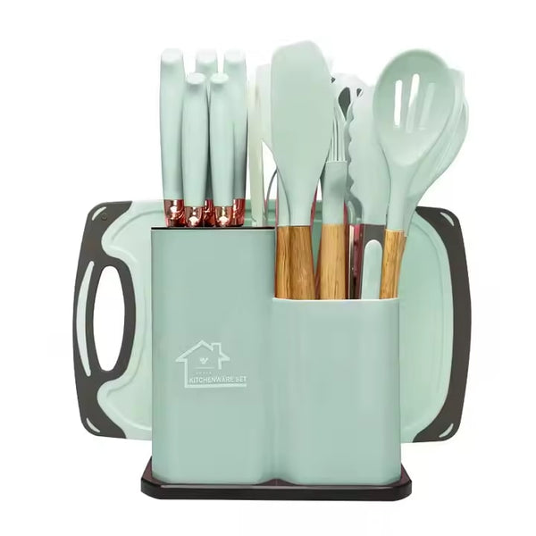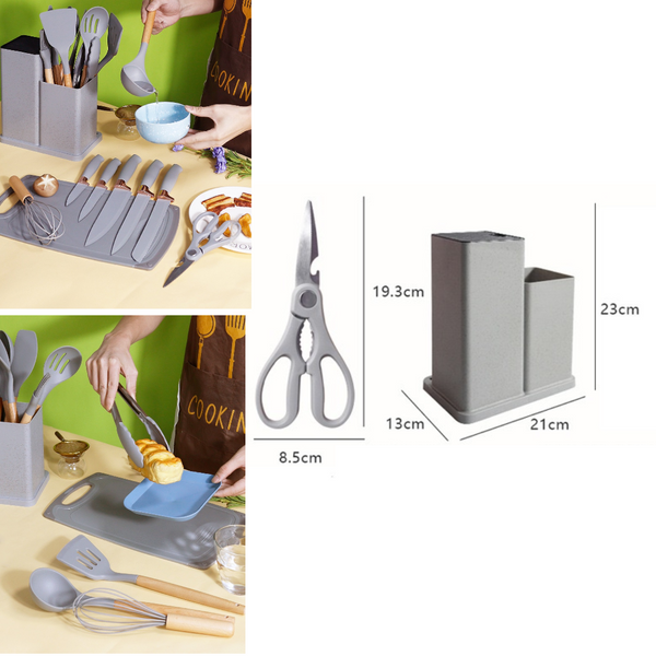 Set de 19 Ustensile de Bucătărie din Silicon cu Suport și Mânere din Lemn