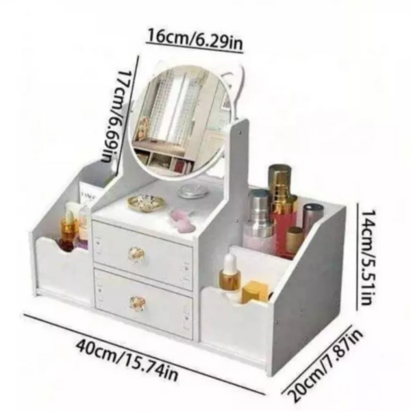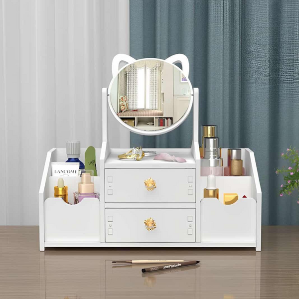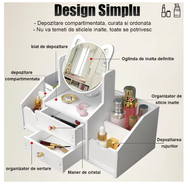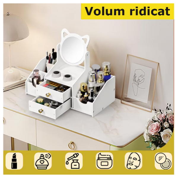 Organizator pentru cosmetice si bijuterii, suport Make-up, Oglinda Pisica, 4 compartimente, 2 sertare
