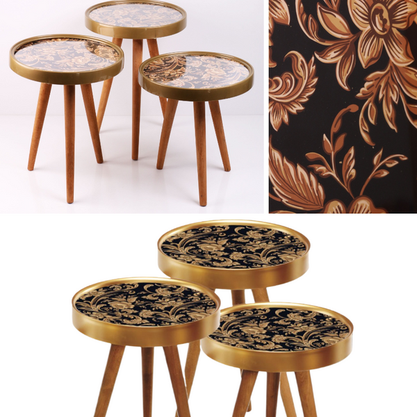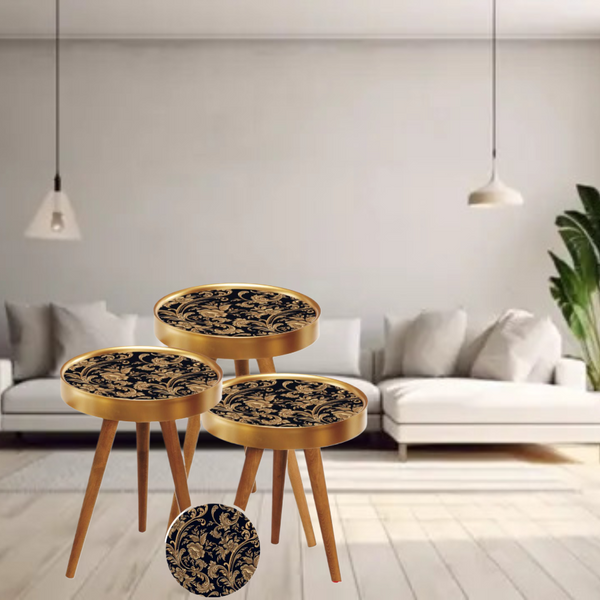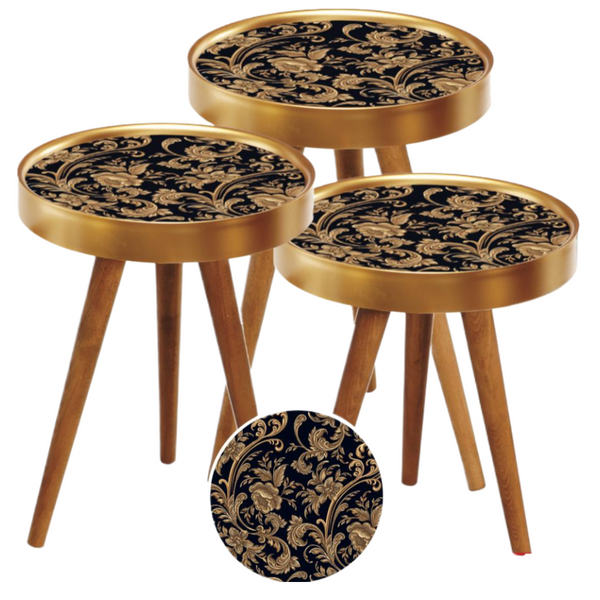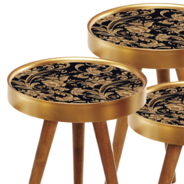 Set 3 Măsuțe Cafea – Mărimi Diferite, Blat Auriu cu Negru, Motiv Floral, Picioare Lemn Natural, Design Elegant și Luxos