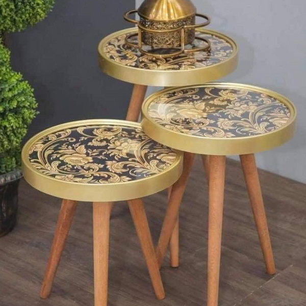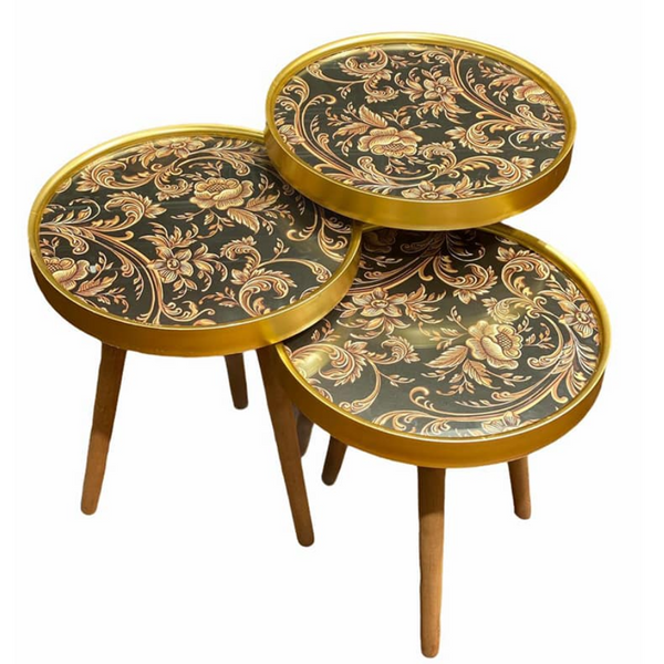 Îmbogățește decorul casei tale cu un set de 3 măsuțe de cafea ce îmbină rafinamentul și funcționalitatea. Blatul auriu cu negru, decorat cu un motiv floral delicat, aduce un aer luxos și modern oricărui living, sufragerii sau spațiu de relaxare. Cele trei dimensiuni diferite îți oferă libertatea de a le aranja împreună într-un set armonios sau de a le folosi separat, în funcție de nevoile tale.
