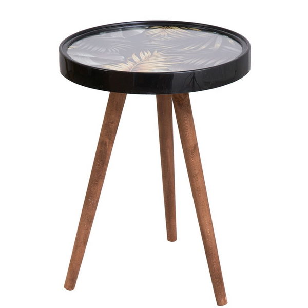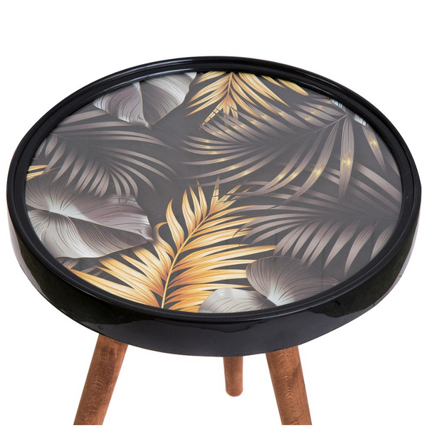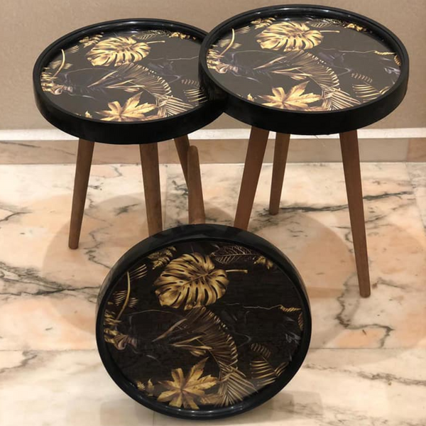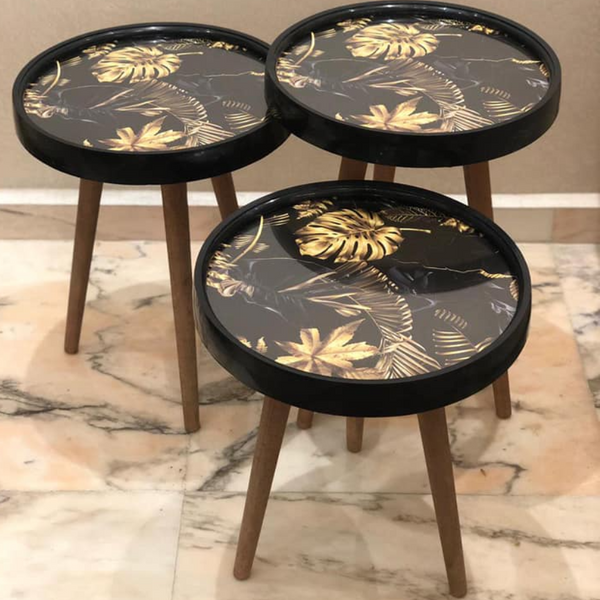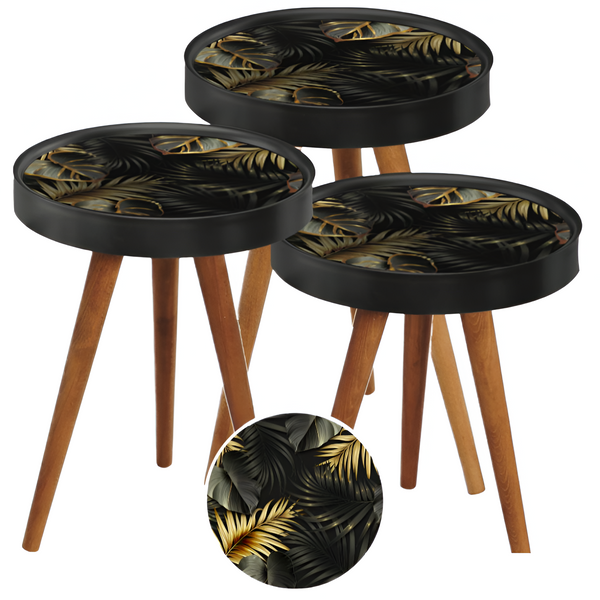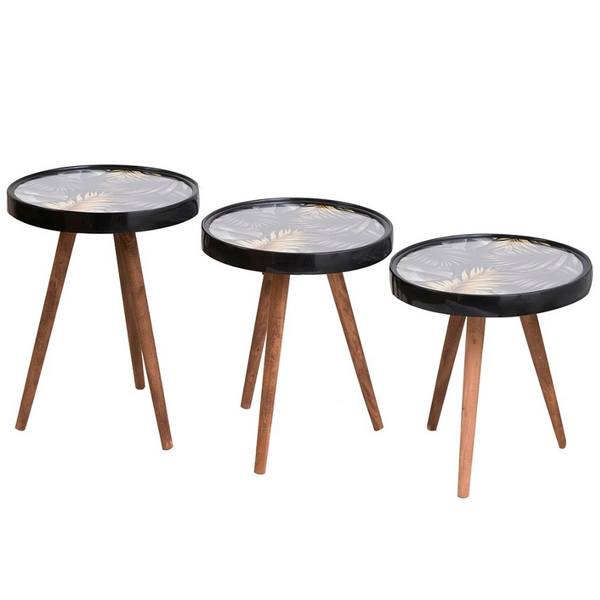 Set 3 Masute Cafea Marimi Diferite Design Tropical, Negru cu Auriu si Picioare din Lemn