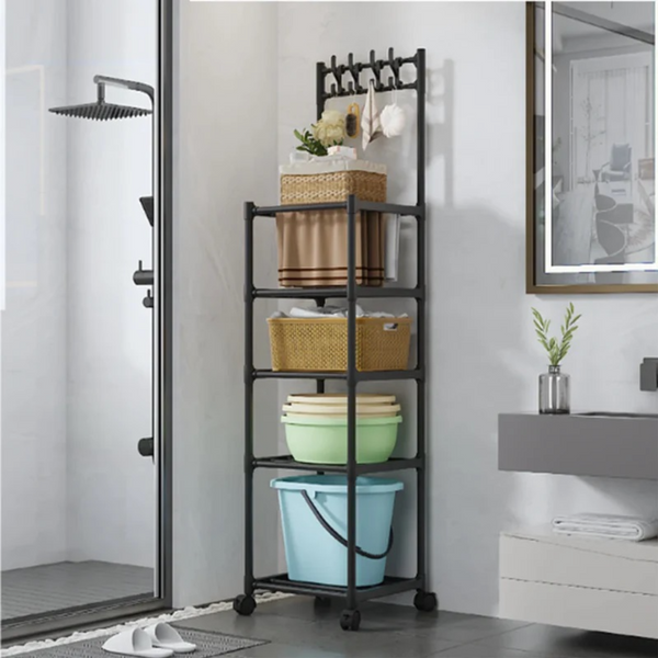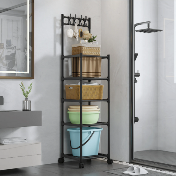 Cele cinci rafturi oferă un spațiu amplu pentru a depozita o gamă variată de produse, de la prosoape și articole de toaletă până la coșuri pentru cosmetice sau detergenți. Fiecare raft poate susține până la 10 kg, ceea ce permite depozitarea unor obiecte mai grele fără riscul de a ceda sub greutate.