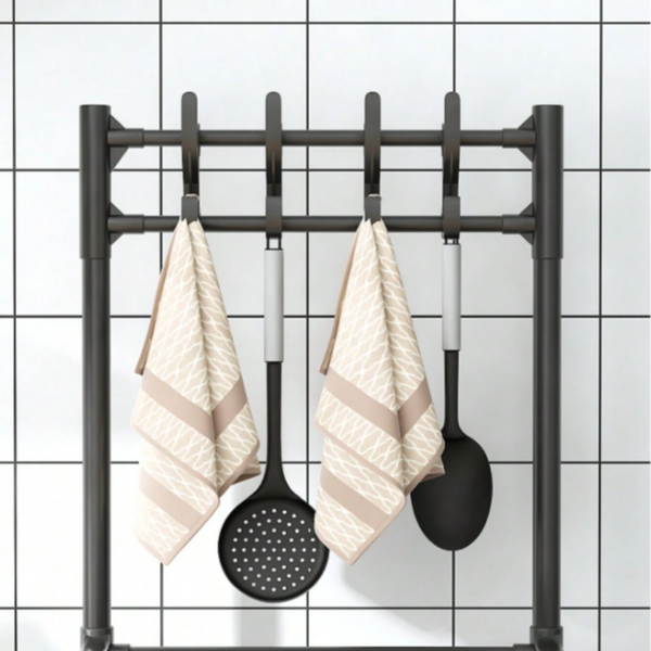 Pe partea superioară, organizatorul este dotat cu un suport de prosoape cu cârlige robuste, perfecte pentru agățarea prosoapelor de mâini, a bureților de baie sau a altor accesorii. Acest detaliu adaugă un plus de funcționalitate și permite păstrarea articolelor necesare la îndemână și bine aerisite, reducând riscul de mucegai.