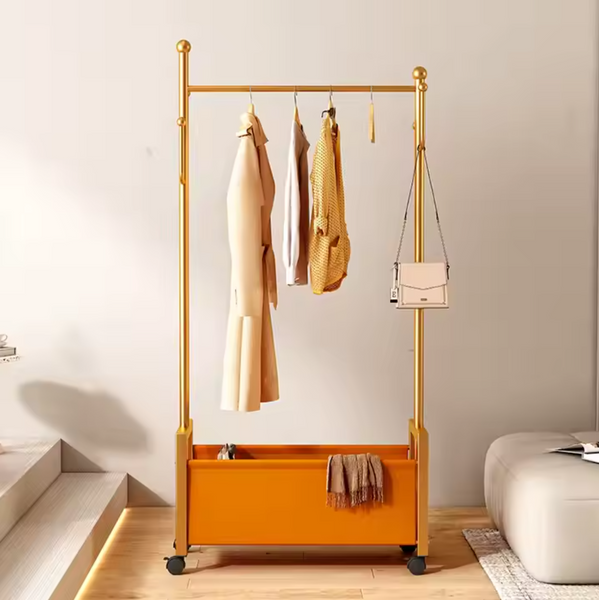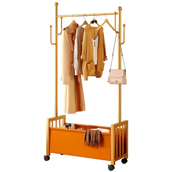 Suport organizator pentru haine, cu roti, bara pentru umerase, 4 cuiere si un spatiu mare pentru depozitare
